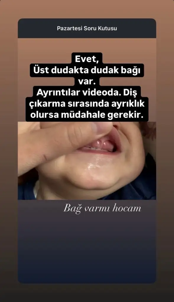 Ben de bilemedim ki. Dişler ayrık çıkmıştı bizim. Tam bunun üzerine instagramda Osman hoca da paylaşım yapmıştı. Dişler ayrık çıkarsa müdahale gerekir. Belki diş ayrıklığına göre karar veriliyor. Bazen dudak bağları ince olup zamanla geçebiliyormuş. Ama bizim dişleri ayıracak kalınlıkta idi.