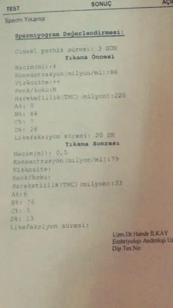 Canim eşinin sperm sayisinda sorun görünmüyor sadece ileri hareketlide sorun var gibi. Ama tedavi oluyirsa da mutlaka düzelme olmustur. Görüntü net olmadigi icin anlayamadim morfoloji yazmiyor sanirim. Ama degerler duzelebilir bence benim eşimin ilk degerlerine yakın. Keciboynuzu kürü yap mutlaka eşine cok faydasini görürsünüz ve aşılama olmadan önce e bitamini çinko gibi vitaminlere başlasın. Doktorunuz ilac vermis miydidoğru diyosun canım,aaynaa eşinin düşük çıkmış boşa yormamışsndr inşallah kendini canım . Birdilimkek en son benim eşimin sperm yıkama testinde değerler düşmüştü bakalım bizde yenilicez sence aşılama tutma ihtimali yüksekmi?