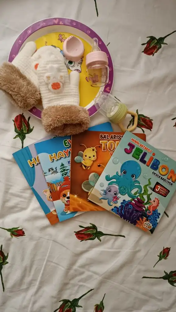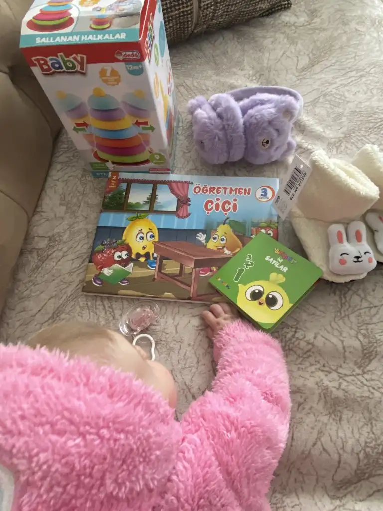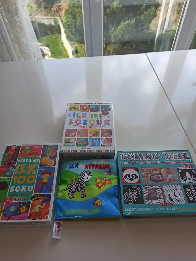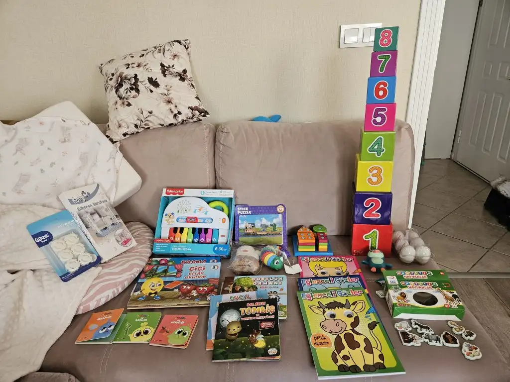 Tırtıl, karton kare kutular, kare ahşap oyuncak bazı kitaplardan ve banyo oyuncağı alcaktım yoktu.