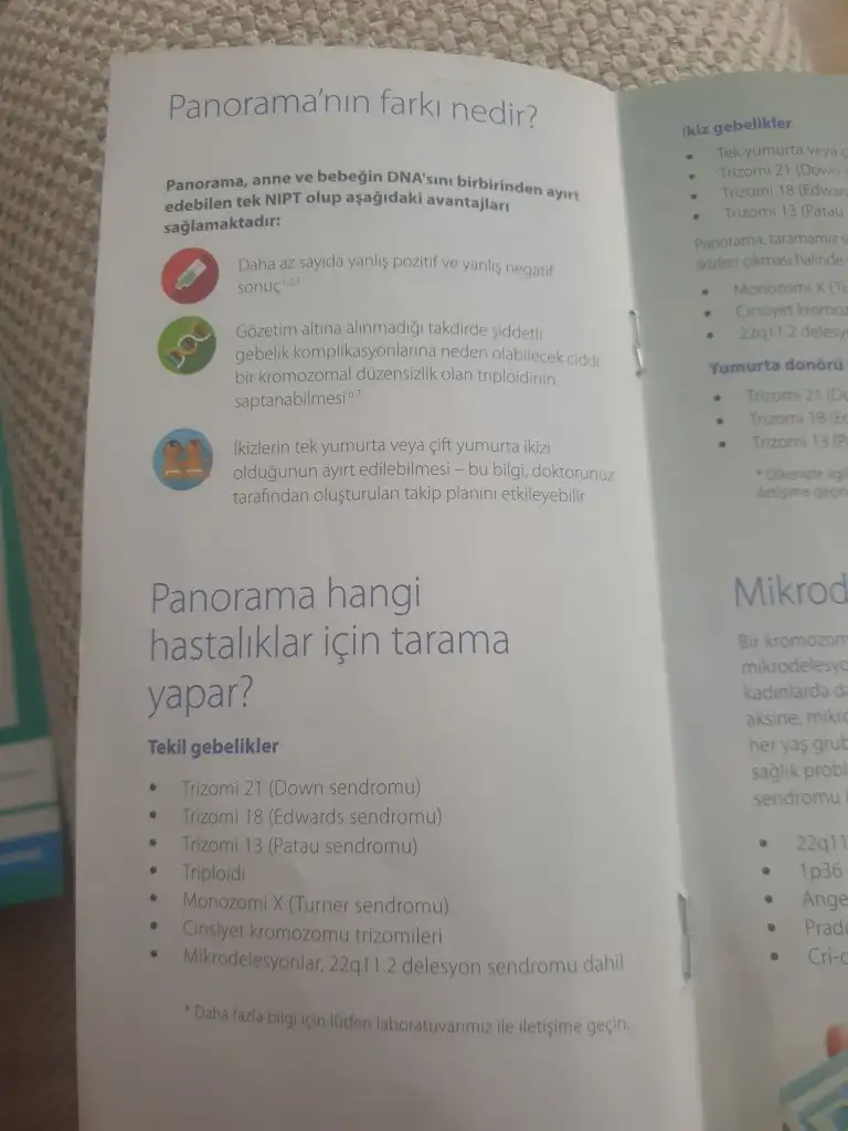 Panaromanın broşurü var mı canım? Bulamadım firmayıCanım ben acıbademe gidiyorum. Doktorum iki firma broşürü verdi biri genox diğeri panorama. Panorama y.dışına gidiyormuş. Genox türkiyede. Sordum genelde türkiyede yapılanları önermiyorlar vs diye. Firma şöyle bir cevap verdi. Biz sağlık bakanlığı onaylı olarak kendi laboratuvarımızda getirtmiş olduğumu cihazlarla yapıyoruz. Diğer firmalar bu onayı alamadıkları için y.dışına gönderiyorlar sizin örneğinizi dedi. Ve kendilerinin y.dışındakinden daha kapsamlı bakabildiklerini söyledi. Bende hastane yönlendirmeli olduğu için (onlar benden daha iyi araştırmıştır mutlaka diye düşünerek) anlaştım. Sonuç için 3-5 iş günü veriyorlar.