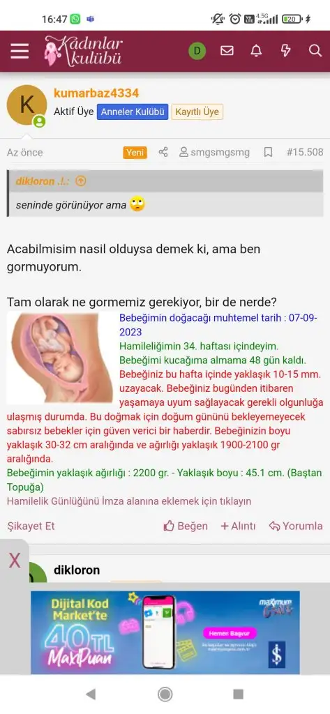 kendi iletilerinin hemen altında görünüyor, gebelik gününle ilgili bilgiler yazıyor