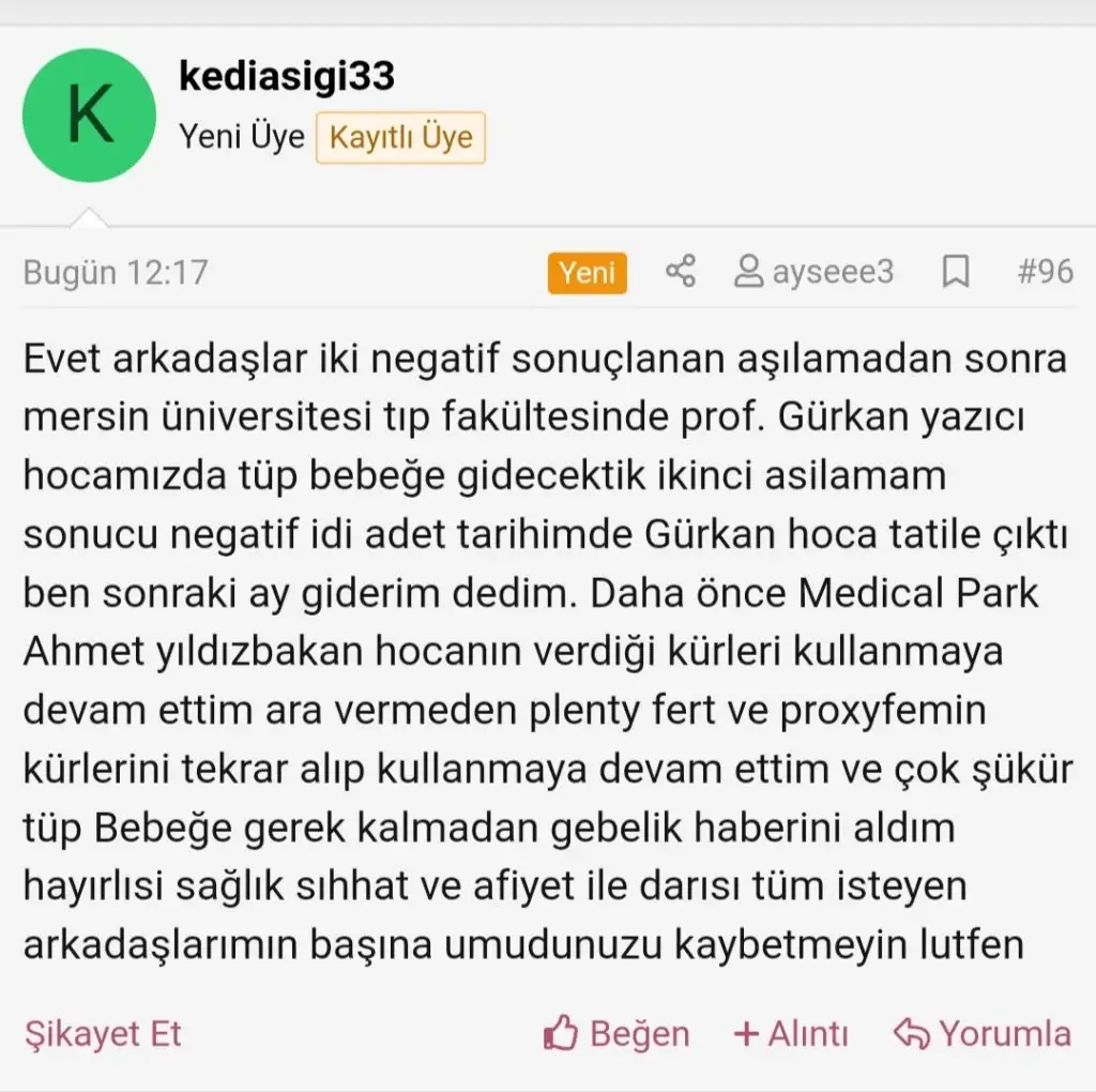 Canım çok kıymetli bu bilgiler. Hemen not alıyorum. Sağol kuzumCanım doktorla konuştuk ya öğrendim hepsini şimdi önce bu genetik testi i yaptiriyorsun eğer testte sorun çıkarsa oluşturulan emriyolar genetigine bakılıyor bozuk olanlar elenerek transfer gerceklestiriliyormus yani önden genetik test yaptırmak önemli hatta doktor dedi ki eğer genetiginizde bir sıkıntı varsa zaten normal gebe kalsan bile düşükle sonuçlanacaktır dedi ki ben bir düşük yaptım belkide ondan oldu bakalım yaptırınca haber ederim 20 günde çıkıyor sonuçlar