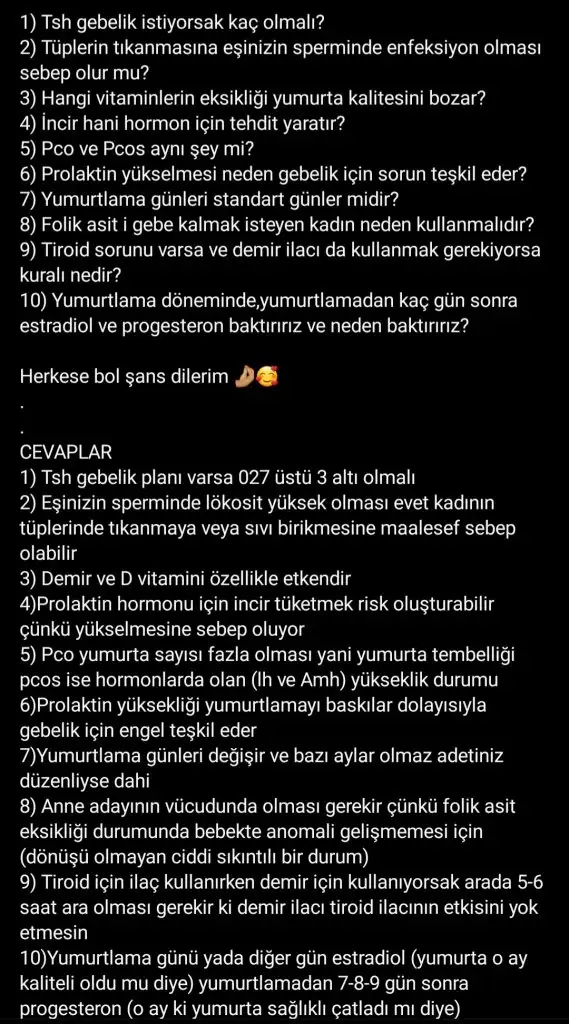 Canım doğru söylüyorsun bende yoğun çalışıyorum bu hafta müsait bi günümde hemen gidip baktırıcam inşallah ama hayırlısıyla inşallah gerek kalmaz bebişiii tutar bu ay çok umutluyum ama hayal kırıklığı da yaşamak istemiyorum bana kalsa hemen gidip sabah test veririm ama işte daha günümüz varİyi canim senin tsh ama 5 ay cok uzun bir sure gebe kalmaya calisiyrsun belli olmuhr bu hormonlara sen yine baktir cnm garantiye al hep isini hamile kalmak icin en fazla 1ile 2.50 arasi olmali zaten gebe iken tsh bir pik yapiyor cnku bebek senin ilk 3ayina kadar senin tsh hormonundan besleniyor ve allah korusun tsh düsük tehlikesi yaratan bir hormon antikorlar bebegi zararli nir madde gorup malesef onum dusmesi icin elinden geleni yapiyor kontrl ettirmekte hep fayda vardr
