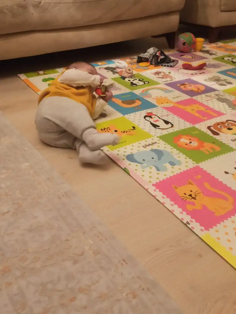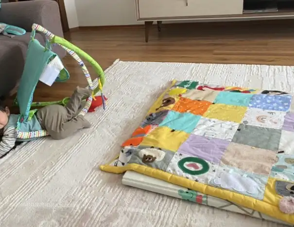 Evimiz küçük, dağınıklık görmek istemediğinden yere bir şey sermek istemiyorum ama mecburen yapacağız, oyun halısını da hep koltukta kullandım. Eşime kalsa yavrumun dönmesine gerek yokmuş ne işine yarayacakmışBiZimki dönmeyi oyun halısının köşesinden destek alarak öğrendi bacağını yaslayıp dönüyordu
