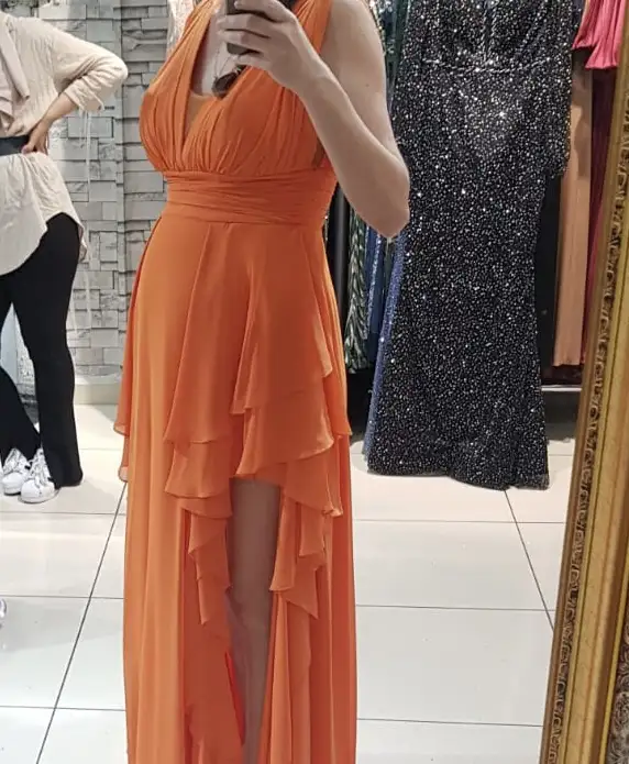 İlk gördüğüm elbiseyi aldım kızlarben çok beğendim hamile abiye giymesi gerekenler düşünebilir. Bana 42 beden oldu düşünün iyi ki netten almamışım yoksa bedeni tutturamazdım. Arkasını bağlamalı yaptırdık terzide karnım daha büyürse diye 29+1 ilk civciv