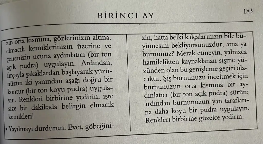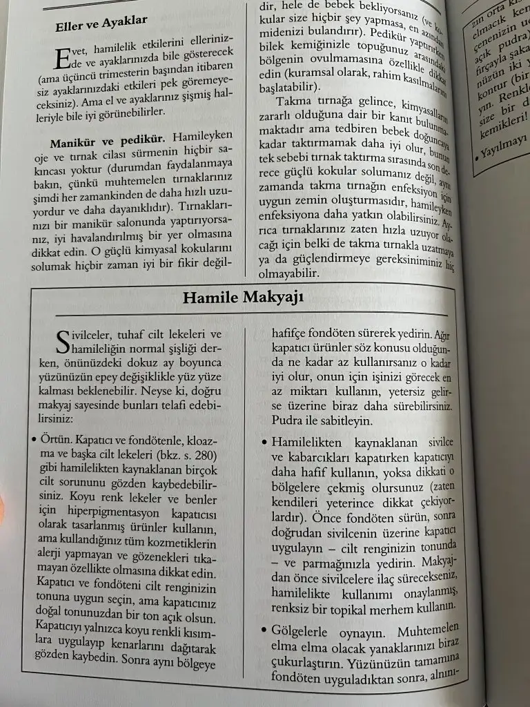 Ben açıkçası hafif yapılan makyajın zararı olacağını düşünmüyorum ve hamileliğimin en başından beri bu şekilde makyaj yapıyorum, saç boyama konusundada 3 ayı doldurmayı bekledim. Yeme içmeye çok dikkat ediyorum ama saç ve makyaj konusunda çok keskin yorumlar okumadım açıkçası bu sebeple esnek davranıyorumbgm21 kitaplardaki tavsiyeler çok genel olduğu için ben uymakta kararsız kalıyorum açıkçası. Gerçi makyaj vb. şeyler cinsel ilişki veya hareket yasağı ya da takviye kullanımı gibi kişiye özel şeyler değil, o yüzden ya zararlıdır ya değildir denebilmesi gerek ama doktorlar arasında da bazı konularda fikirbirliği yok herhalde. Ben de paylaşayım kendi kitabımından ilgili kısmı: