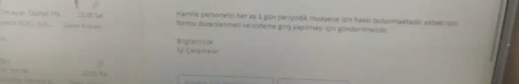 Ben genelde hastaneden dönüşte barkod ekliyorum izin formuna işyerim onay veriyor. Sıkıntı yapmıyorKızlar bir şey daha soracağım çalışan hamileler ayda bir doktora gittiğinde o gün izinli sayılıyor ya ben bunu iyice öğrenmek için şirket İK’sına mail attım yaptığı dönüşü aşağıya koyuyorum. Mağaza müdürüde bana doktora gittiğine dair ondanda evrak alacaksın diyor. Ama bu izin formu düzenlenmesi yeterli değil mi?
