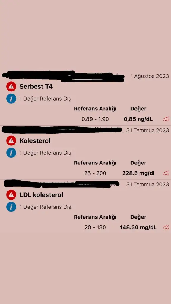 Kolesterol ile ilgili bilgim yok ama t4 referans aralığında görünüyor aslında önlem amaçlı görünmeni istemiş olabilir hızlı düşüp yükselen bir değer belki ondandırEki Görüntüle 3281417