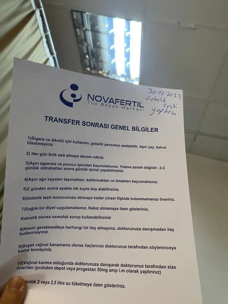 Ay hadi maşşallah güzelce tutunsunlar inşallahkızlar hepinize teşekkür ederim. transfer oldum 2 adet 3. gün iyi kalite. cok kolay ve kısa bi işlemdi hiçbir şey hissetmedim 5 dk sürdü. 20 dk sonea hareket edebilirsin dediler harekette agır iş hariç hiçbir kısıtlama onermedi doktorum. progestan tablet 200 mg günde 3 tane, clexane günde bir, prolutex iğne günde bir, estrofem günde 3 adet sürekli kullanacagım ilaçlar bunlar. transfeeden çıkınca da ovitrella ve progestan iğne tek seferlik yaptılar. 12 gün sonra test dedi nasıl gececek acava günlerim iyi ki burası var paylaşıp rahatlıyoruz