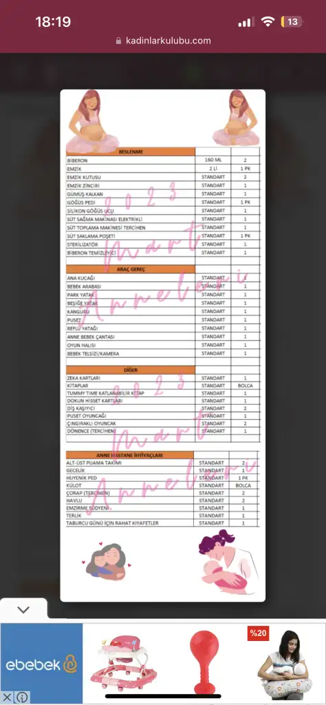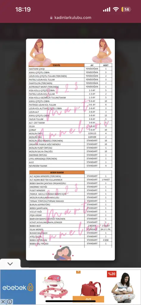 Arkadaşlar bebek ihtiyaç listesinden neyi ne kadar aldığım ve eksikler karışmaya başladı. İlk sayfadaki listeleri fotoğraf değil de yazılı olarak telefonuna bilgisayarına kaydeden oldu mu olduysa rica etsem bana da atabilir mi hepsini tek tek yazmak çok zor geldi hazıra konayım :)