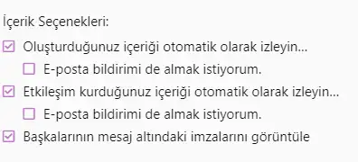 Girdiğiniz sayfada "İçerik Seçenekleri" başlığı altında "Başkalarının mesaj altındaki imzaları görüntüle" seçeneğinin seçildiğinden emin olun.