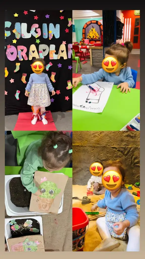 Ne güzel siz baya düzene oturtmuşsunuz, bizimde iki üç aya düzene girer diye düşünüyorum. Şu an daha etrafı tanıyor her oyun alanına gitmek istiyor mutfakta vakit geçiriyor çay pasta seti vs var zaten evde de sürekli bebeklerine yemek yapıyor 😀 evde hep bizi yemek yaparken görüyor ondan bence😀 oturup masada boyama yapması etkinlik yapması biraz vakit alacak kısa süreli oturdu beni istedi yanında biraz oturdum sonra kumda oynarken istemedi aşağı indim kameradan izledim biraz daha büyükler tabi daha iyiydi bu konuda bu cumartesi yine gideceğiz güncellerim buraları. aferin ekine dansını sevsinler onun 💕