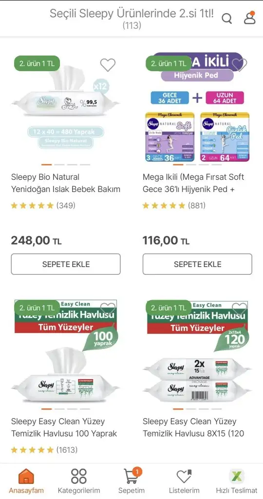 Hepsiburada da sleepy ürünlerinde 2.si 1 tl kampanyası varmıs bilginiz olsun