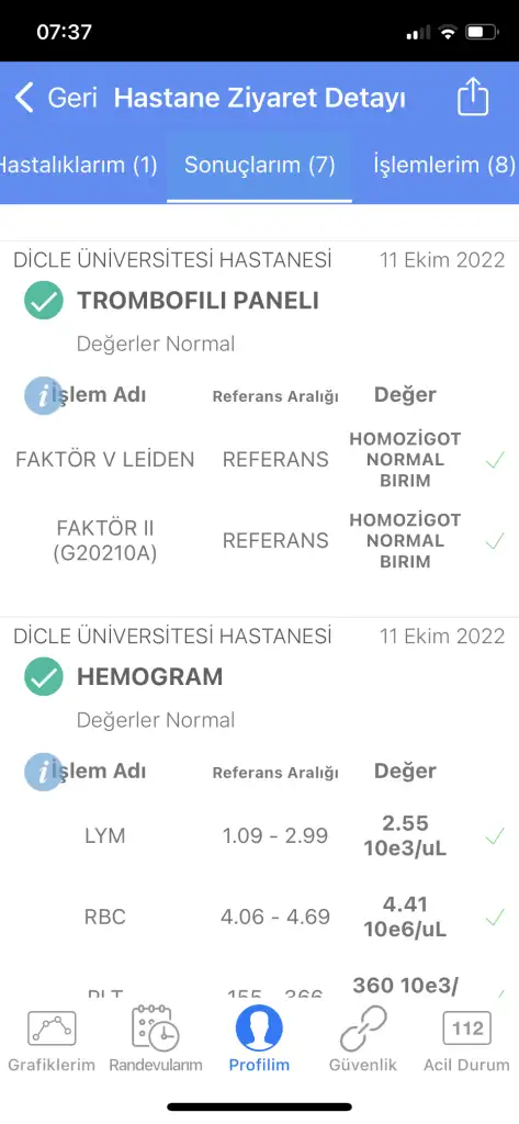 Merhaba normal görünüyor benım pıhtılasma eğilimim var mesela faktör V leiden heterizigot , sizde normal cıkmıs , normalde 6 degere bakılıyor trombofili panelinde ama bazı üniversite hastaneleri artık mthfr ve pai gibi mutasyonların gebelik kaybında etkisi olmadıgını düşündüğü ve gereksiz kan sulandırıcı kullanmaya tesvik ettiği için yalnızca faktör V ve faktor II baktırmayı tercih edıyor . Değerleriniz normal görünüyor ,hakkınızda hayırlısı olsun.merhaba yorumunuza istinaden yazmak istedim. kan testi verdim sonuçlarım çıktı fakat bugün hafta sonu olduğundan gösteremiyorum. 1 kalbi duran 1 de kimyasal gebeliğim var. sizce pıhtılaşma var mi
