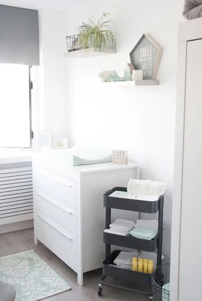 Kızlar bu arada ben baya baya eşyalarını aldım sayılır bebişin. Daha kurulumları yapmadık ama benim gibi başta bebeğe oda yapmayı düşünmeyenler için Pinterestten bulduğum şu fotoğrafı paylaşmak isterim. 😍 Biz başlangıçta yeterli olacağını düşünüp Ikea’dan bu fotoğraftaki gibi şifonyer ve tekerlekli servis arabasından aldık. Şifonyerin üzerine de BabyJem marka kundaklı alt açma minderi sipariş ettim. Servis arabası tekerlekli olduğu için banyoya, salona vs de getirilebilir gün içerisinde. İlk defa anne olacağım için en kullanışlı şeyleri bulmaya çalışıyorum, tecrübesizlique. 😁🥲