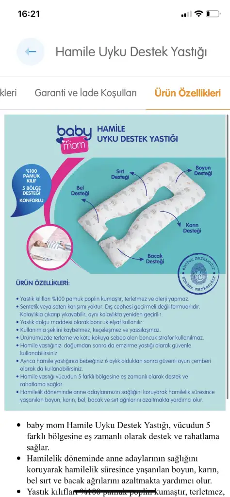Ay şeklinde yastık al diyor. Bebeğe de kullanırsın diyo. İçine bebek de koyuluyormuş. Kılıfı çıkarıp yıkanabiliyormuş.