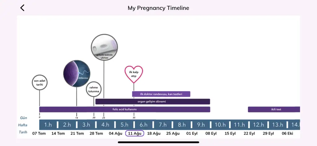 Bir de ben Dr. Banu Çiftçi’nin gebelik takibi uygulamasını çok beğendim. Onu da öneririm kızlar. Böyle bir çizelge ile son haftalara kadar neler oluyor gösteriyor. Döllenme zamanına dek. Ve çok tutarlı. İlk kalp atışı zamanı bile var. Neler olacağını tek tek anlatıyor hafta hafta
