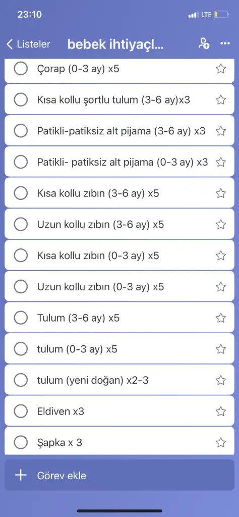 Listedeki eldiven ve şapka hariç hepsini aldım. Demek ki doğru yoldayım.Ben de daha bebişler için hiçbirşey almadım. Kızımda da almamıştım 7. Ayda bi hastane cıkısı almıstım sonrasını 8. Ayda falan aldım hep. Bu sefer kıyafet değil de bebek arabası alalım demiştim aslında ama vazgeçtik.Bir miktar birikmişimiz var onunla yatırım yaptık 7. Ayda kısmet olursa bozdurup alırız dedik. tek yumurta ikizi, yaşım da var kendince riskleri var, bazen korku geliyor yalan yok Allaha emanet hepsi sağlıkla gelsinler de herşey hallolur. Hem doğumdan sonra bile bebişle çıkıp bişeyler almak çok keyif veriyo insana değişiklik oluyor sonradan bile alınabilir. Kabaca bir alışveriş listesi yaptım ben paylaşayım fikir olur belki. Benim sayılar x2 olacak tabi listede iyice karışık olmasın diye böyle yazdım