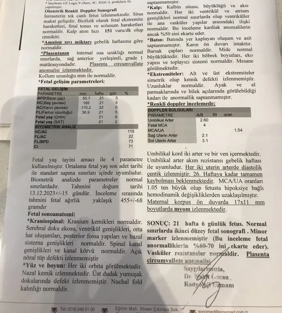 Şükür canım bir sıkıntı çıkmamışBen tüp bebek doktorumu halen değiştirmedim kendi doktorum bakacak sandım bakmadı tıbbi görüntüleme merkezi ve laboratuvarına yönlendirdi oraya gittim tam 1.30 saat sürdü uzun sürmesinin sebebi bebek çok hareketli idi o yüzden zorlandı biraz sanırım 2.500TL verdim ek de ki rapor sonucunu verdi anatomi yapısında bi sıkıntı yok dedi oradaki doktor ve gönderdi sonra kendi doktorum aradı sonucun iyi olduğunu herhangi bir sıkıntı görünmediğini söyledi