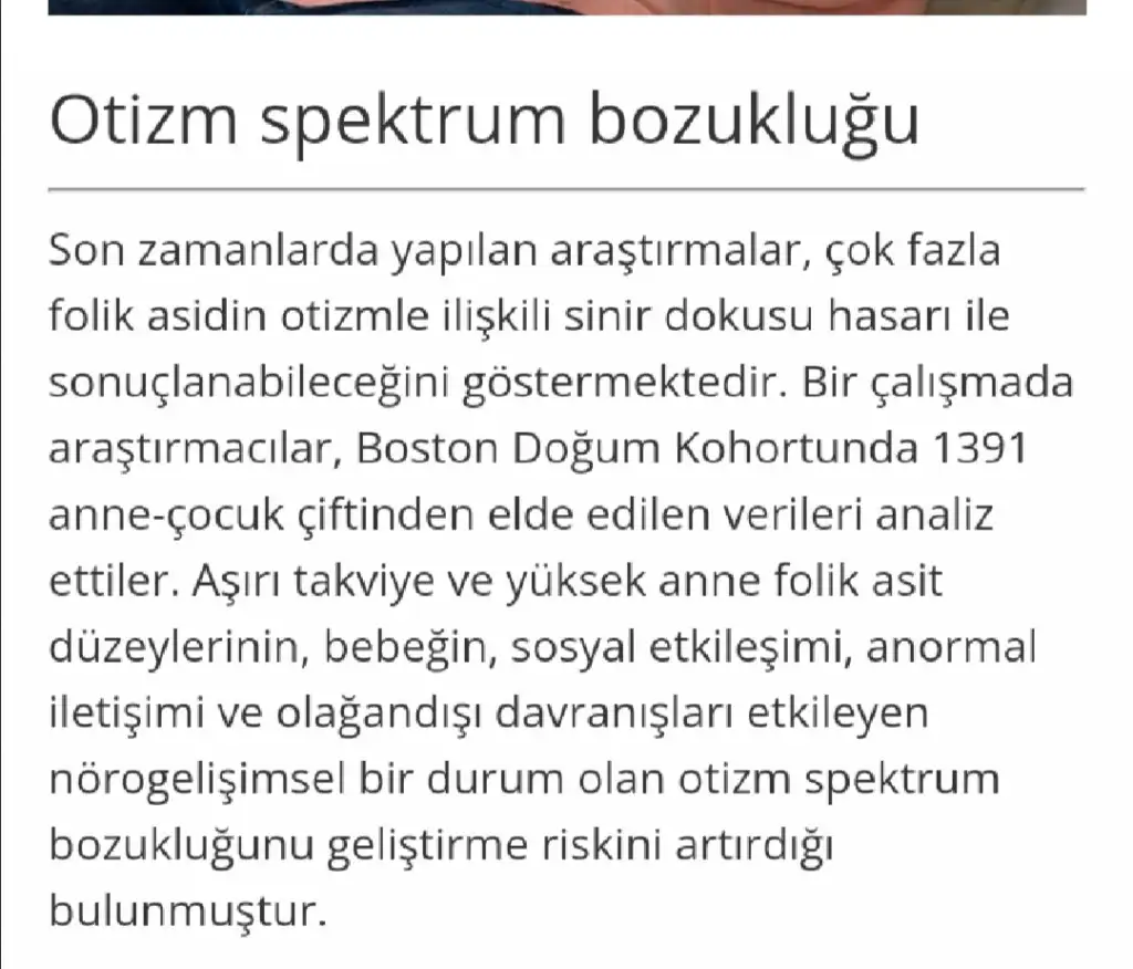 Otizim ile ilişkilendirilen folik asit ise sentetik yani bizim şuan aldığımız takviye formları, onlar sentetik oldukları için vücuttan atılmaları için değişime uğramaları gerikiyor ve bu değişim sonucu ortaya çıkan ürünün otizim ile ilişkisi var. Bu değişerek atılan ürünün de depolanması ile bilgili bilgiyi araştırmadım, sorun burada yatıyor olabilir. Ne kadar çok sentetik alırsak, o kadar çok risk var demek.