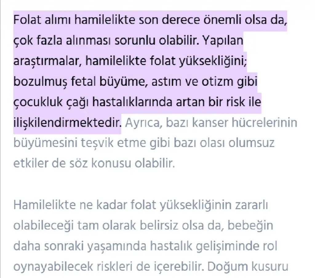 Bu bir ara facebook gruplarinda yazıldi, asi karşıti olan gruplarda doğruluğu ispat edilmemiş diye biliyorum. Ben ilk hamileligimde çok geç başlamıştım ve cok endişelenmiştim folik asit yetersizliği spina bifidaya neden oluyor . Şimdi mesela reginesis max kullanıyorum icinde günlük doz var ekstra kullanmadim folik asiti ,9 ay boyunca kullanilack dedi doktor icinde omega 3 var ama herkes kendi doktoruna güvenmeli..ilk hamileligimde prof. Gidiyordum mesela hic decavit, magnezyum vermedi ben baska doktora giderken decavit, magnezyum ve calsiyum vermişti. Her doktor farkli ilerliyorFolik asitin fazlası otizm yapar saçma bir bilgi kim diyorsa bugün sağlık bakanlığı işlem yapar hakkında . O kadar insan içiyor bir zararı olsa kim bu riske girsin. İçmeye gerek olmayabilir dışardan besinle yeterince vitamini alıyorsa zaten ne gerek var.