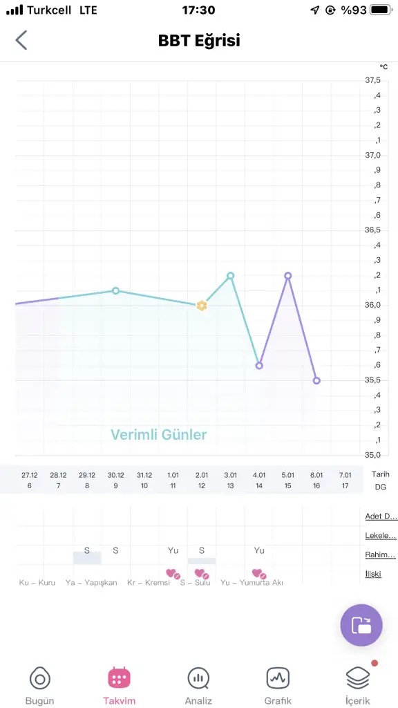 Gerçekten farkliymis ama güzel bence. Peki benim adetim biteli baya oldu ama yumurtlama tarihi gelmedi daha sizce ölçmeye başlasam mi şimdi sağlıklı sonuç olur mu yoksa olmazsa diğer ay mi ölçmeye basliyayımAteş on numara bir olay çözersen. Hemen anlatıyorum. Her gün sabah aynı saatte kalkıp dil altından ateşini ölçüp ff app programına kaydediyorsun. Her gün.Adetten yumurtlamaya kadar olan ateşin senin normal vücut ateşin oluyor. Yumurtanın çatlayacagı gün ateşin düşük, ertesi gün de birden yükselişe geçiyor. Bak tablomu atıcam şimdi.22. Gün ateşim düştü, 23te yükselişe geçti o ara yumurtlama oluyor. Sonra adete kadar ateşin yüksek seyrediyor. Eğer adet günü ya da adete birkaç gün kalası ateşin düşerse gebelik yok demek ama yüksek devam ederse adet gününe ve sonrasına kadar gebelik var demek. Yani inşallah. O süreçte yerleşme düşüşü dediğimiz bir ateş düşmesi de yaşayabilirsin. Birkaç ay ölçüp programa kaydet kendin hakkında fikir sahibi olursun. Program da senin hakkında bilgi sahibi olur