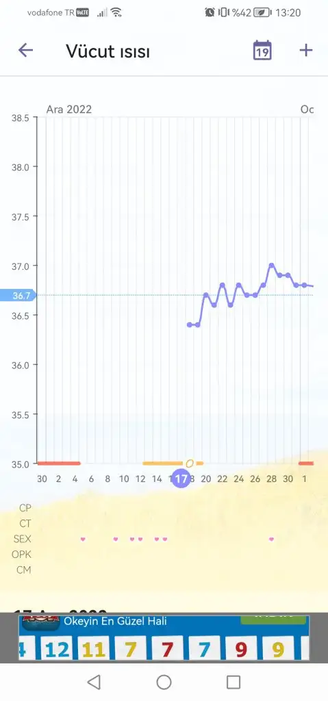 Mutlu olan grafik yumurtamamdan sonraki zaman regli olduğum ateşim 36.7 de olsun daha sonra sarı olan grafik ise reglim biter bitmez yaptığım ateş ölçümüm şuan yumurtlamayı göremiyorum grafikte sizde göremediniz galiba. Bugün yaptığım testte az önce gördüğünüz ovülasyon testi