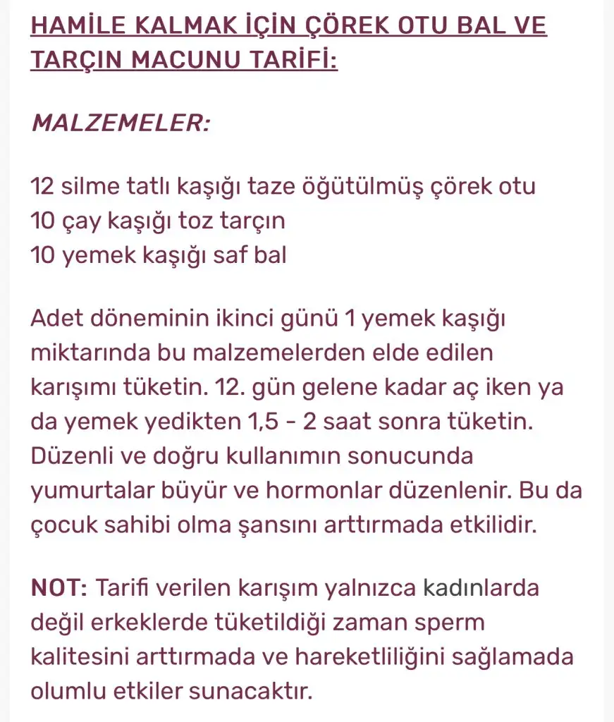 Evet baktım internetten cnm ama bi sürü tarif var hangi ölçü ile hangi günler yenecek kafam karıştı vallahi billahi deYumurtalıklara adet düzenine iyi geliyor diye biliyorum canım saraçoğlunun kürlerinden biri ölçüsüde var yazıyor her yerde ama ben kafama göre yapıyorum ölçüsünü bal+çörek otu+tarçın