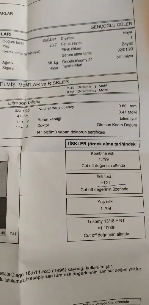 Teste göre Dow senduromlu olma olasılığı var dedi fetal DNA söyledi TM dedim yapalım bana 6 bin TL dedi duramadim çıktım özele gittim bende özelde burun kemiği gözükmüyor dedi test için oda 8 bin istedi 😭😭 zaten fazla durumum yok abartılı konusucak değilim yaptıramam bu testi ben