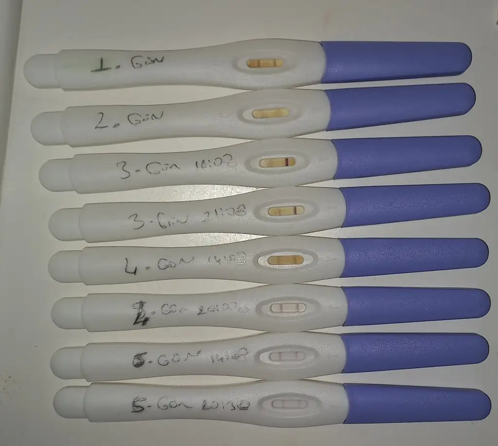 ovulasyon testleri. en üstteki 31 aralik sonraki 2 ocak sonraki 4 ocak en sonkide 7 ocak az önce yaptim. anlamadim ben ya bu testler durdukce rengi aciliyor sanki. 4 tane vardi yaptim baska alamam. degerlendirmeye calisiyoruz. yumurta ne zaman catladi yada catlayacak ? en sonki test dahami koyu bi öncekinden ? cok zaman gecti dogum kontrol hapini birakali bugün 27. gün. degerlendiriyoruz o günden beri. yumurta catlamamismi bende acaba daha ? baska test yapamiycam artik. 21 ocakta yani dogum kontrol hapini biraktiktan 41 gün sonra oluyor sanirim. o güne kadar zaten ya adet olurum yada erken gebelik testinde birseyler görünür belki. nasil sabredecegim o güne kadar bilmiyorum. daha öncesinde birseyler hissedersem erkende yapabilirim testi paylasirim yine burada.