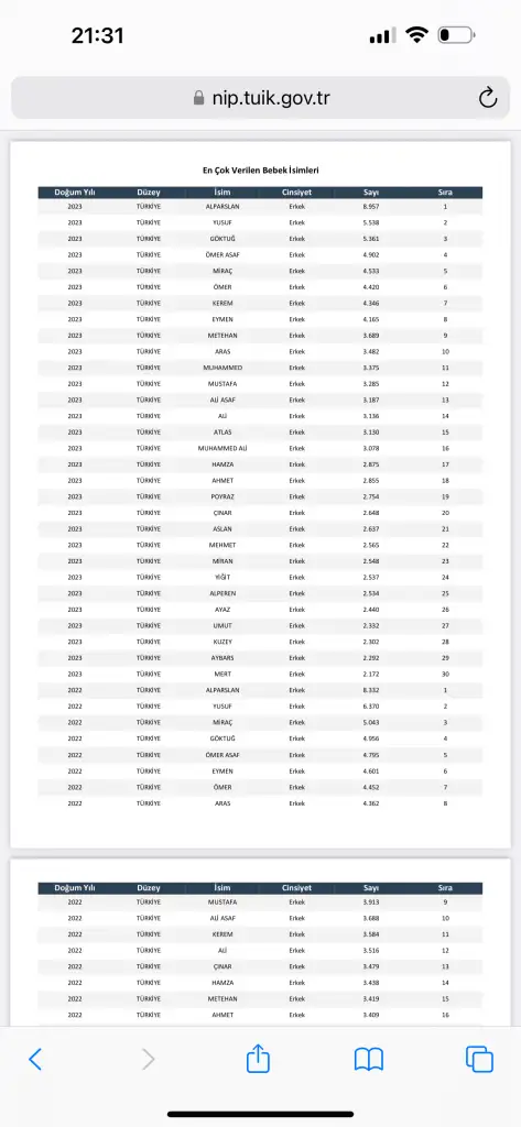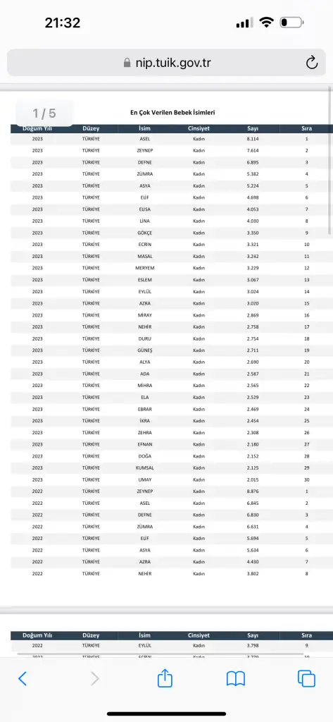 Asya koycam maalesefCanımssss bakın ne buldum, Tüik’in verilerine bebişin doğduğu yıla bakıp en sık verilen 30 ismi görüyorsunuz. Ben ilk 30’u seçmezdim muhtemelen, size de fikir olsun![]()