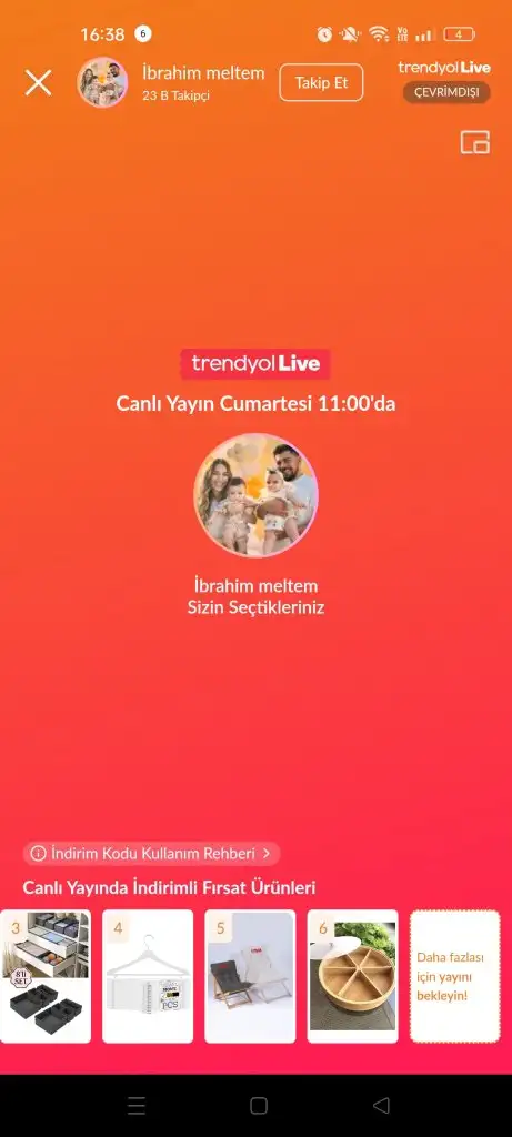 Aynen öyle öncesinden gösteriyor yüksek indirim olacak ürünleri trendyol, eğer indirimden yararlanmak istiyorsanız öncesinde başka yayın izleyin çünkü saniyeler içinde bitiyor kod bir alıştırma yapın ben öyle birkaç ürünü kaçırdım çünkü özellikle oioi seti 500 liraya gelecekti çok üzüldüm canlı yayın ekranı küçülüyor sepetine gidiyorsun sunucu ağzından kod çıkar çıkmaz yazıyorsun sonra hemen satın alman gerekiyor kredi bilgileri hazır olacak
