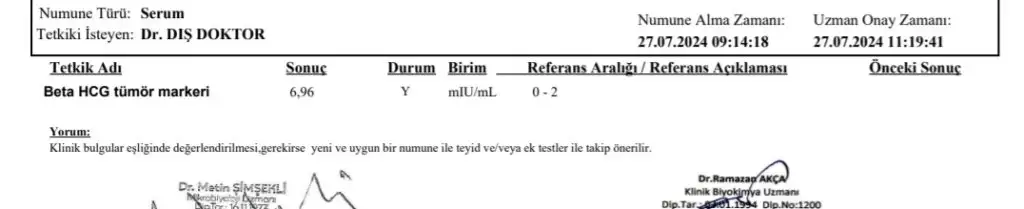 Canım bende şimdi baktım googleden örnek beta hcg testlerine 0-2 yazıyor sende referans aralığı 0-5 olması lazım ve tümör markeri yazmasınıda anlamadım bence yarın bi sor kan verdiğin yereKızlar kan testimi ablamla paylastim az önce mahallemdeki hastanedr gebelik testi dedim bana beta hcg tümör markeri yaziyor 6.96 diye ablamda diyor bu gebelik testi degil sana baska bisey yapmislar bi bakar misiniz kimseye soramiyorum bu gebelik testi demiEki Görüntüle 3458042
