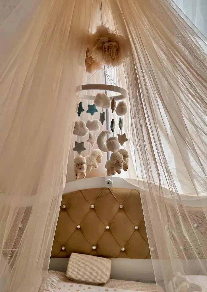 Yaptığım dönenceyi de astım bu sabah🥹 Yuvarlak kısmı mukavvadan yaptım diye azıcık yamuk olmuş ama o kadar sevdim ki😍 İnşallah bebeğim de sever çünkü bunu yapmak için en sevdiğim çoraplarımdan birini kestim😅 Sağlıkla oynar inşallah
