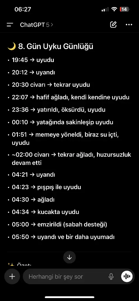 Of ben de ChatGPT yle bir daha mı başlasam diyorum. Baya halletmiştik ama bu ara yine isyanlardayızAy benim de ilerlediğimizi düşünüp son aşamaya geçirdi ama ben daha mayıştırıp koymakta bile başarısızım. Gerçi biliyor musunuz geçen gece ilk kez mayıştırıp bırsktım gözleri kapalıydı önce biraz pat pat pışpış yaptım sonra çektim kendimi sadece sesle destek verdim ve kendi kendine uyudu. Ama bi daha da olmadı ckfkdk