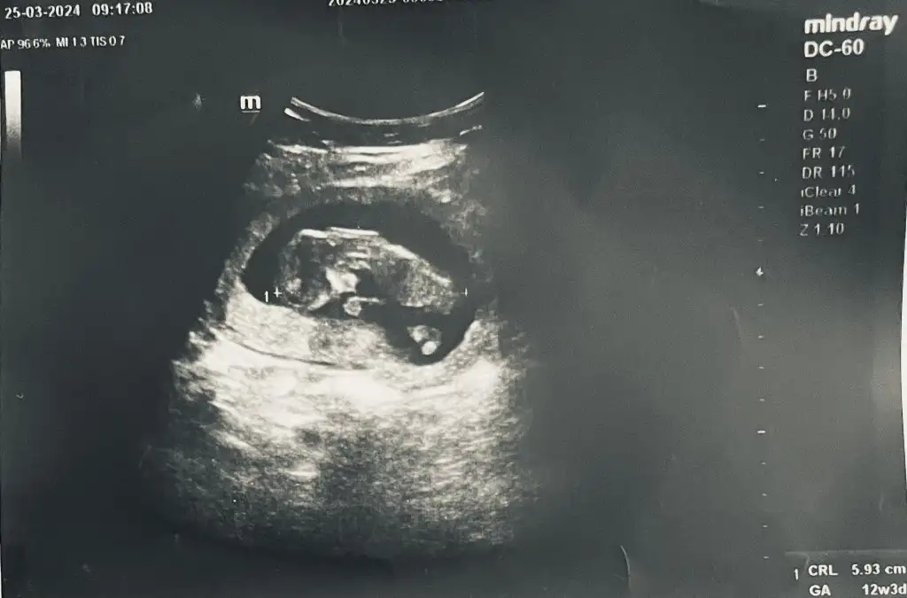CRL' ye göre 56 mm 12 hafta 1 gün ile uyumlu, FKA (+), intrauterin tekil gebelik mevcuttur.