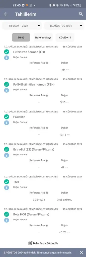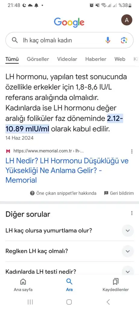 Adetliykenmi baktılar bunlar adetin 2.3. günü olan testlerinmidir oda çok önemli döngünün hangi gün bakıldığıMerhaba35 yaşındayım. 7 yaşında 1 oğlum var. Ekim 2023 te 9 haftalık bebegimi düşürdüm 6 ay sonra tekrar denedik eşimle zorunlu ayrılık yaşıyoruz. Aşırı stresliyiz ikimizde.Nisan haziran ve ağustos ayında denedik olmadı. Doktora gittim kan verdim sonuçları böyle çıktı. 2 gün önce sonucu gösterdim doktora bana dedi ki bebek düşünüyorsan eşin gelince eşinle beraber direk ınfertiliteye git lh değerin çok düşük dedi. Hiç bilgim yok bu lh düşüklüğü nedir neyden olur. Aydınlatan olur mu beni. Çok mu kötü degerlerim