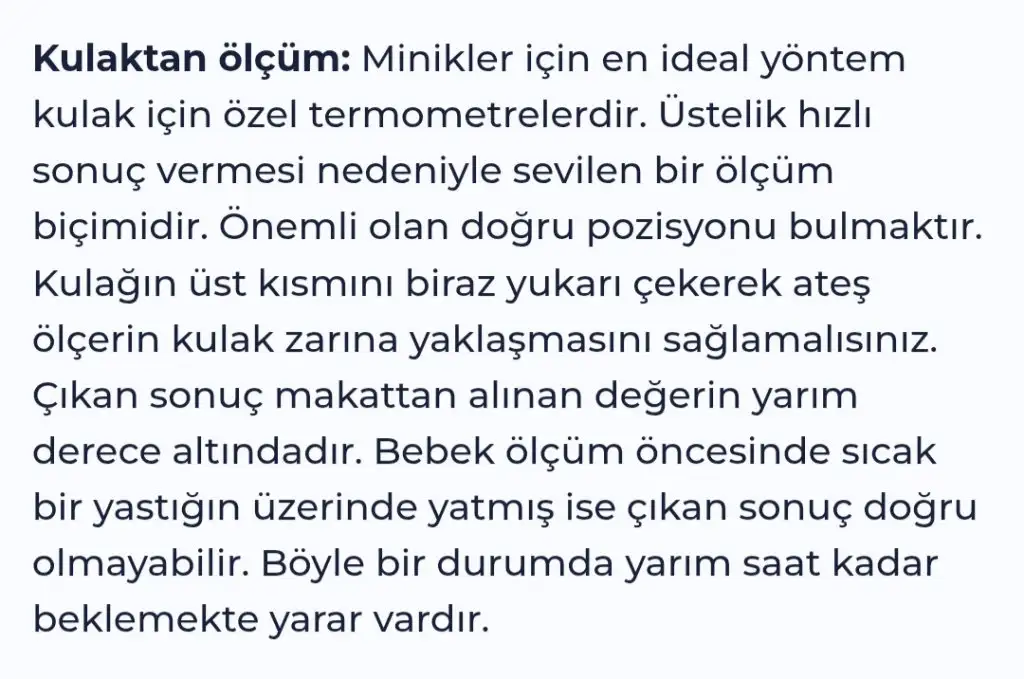 kullanma kılavuzunu bulamadım şimdi ama internette yazanla aynı şekilde yazıyordu canım. kulak zarına nasıl yanaştırabilirim bilmiyorum valla ama itebildiğim kadar itiyorum. teyit edebileceğim bişey de yok çünkü koltukaltı ölçümü farklı oluyor :/Allah Allah ben direk kulağına değdirip yapıyordum, yanlış mı yapıyormuşuze boşluğa tutunca nereyi ölçüyor