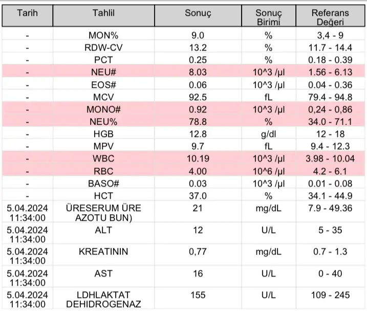 Bu tabloda WBC-lökosit (bağışıklık sistemi hücreleri miktarı), RBC-erisrosit (kırmızı kan hücreleri miktarı) olduğunu biliyorum, tek bildiğim bunlar benim. Referans aralığına çok yakın gözüküyor hepsi ama yorumlayacak bilgim ve uzmanlığım da yok ne yazık ki.