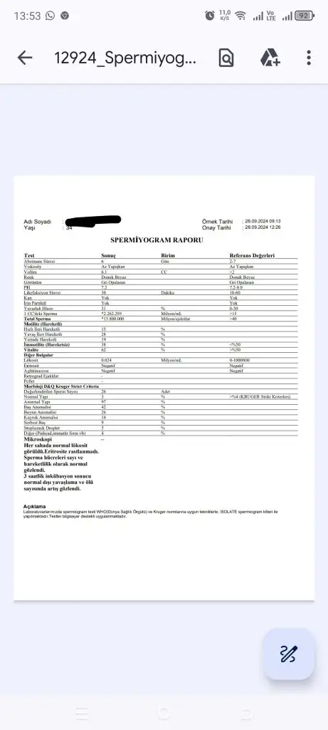 Kızlar bizde de test sonuçları karmaşık. Sayısı 46 milyon. İleri hareket %67. Ama morfoloji 0. Doktor dün eşime önce ilaç verelim demiş. Olmazsa varikosel ameliyatı olabilir. İlaç olarak da klomen vermiş, bir de adını hatırlayamadığım bi takviye. DNA hasarı da %23.Sizin sayısı iyiymiş canım morfoloji 3 de kötü değil zaten. Bak bizimki böyle.