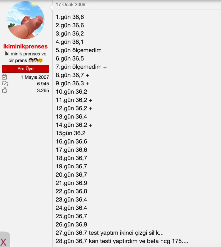 evet ya içime azıcık su serpti sabahtan ateş tablolarına bakıyorum kızların))) kaç aydır ateş takibi yapıyorum bu ay tablom değişik olduğu için çözemedim, evet geçen sene aktif katılıyordum foruma sonra bıraktım psikolojim bozuluyordu)))Tamam buldum tabloyu ateşine göre 10 gün yerleşme olmuş canım normalde 7-10 gün arası yerleşme olur zaten benimkisi 7 günde yerleşme oldu adetimden 3 gün önce öğrendim aynı bu sabah yaptığın test gibiydi seninkisi de 10 günde yerleşmiş ve adet gecikmenin 6 gününde bu şekilde çıktı bende bebek var canım geç yerleşme olduğu için bu şekilde adet sancılarını kafana takma benimde öyleydi umarım içini rahatlatmıştır yazdıklarım bunu anlamanın en iyi yani yarın sabah bi test daha yap baktın koyulaşmaya başladı kan ver 2 günde bir takip et. Seni geçen sene afranın topiğinden tanıyorum umarım güzel haberler alırsın