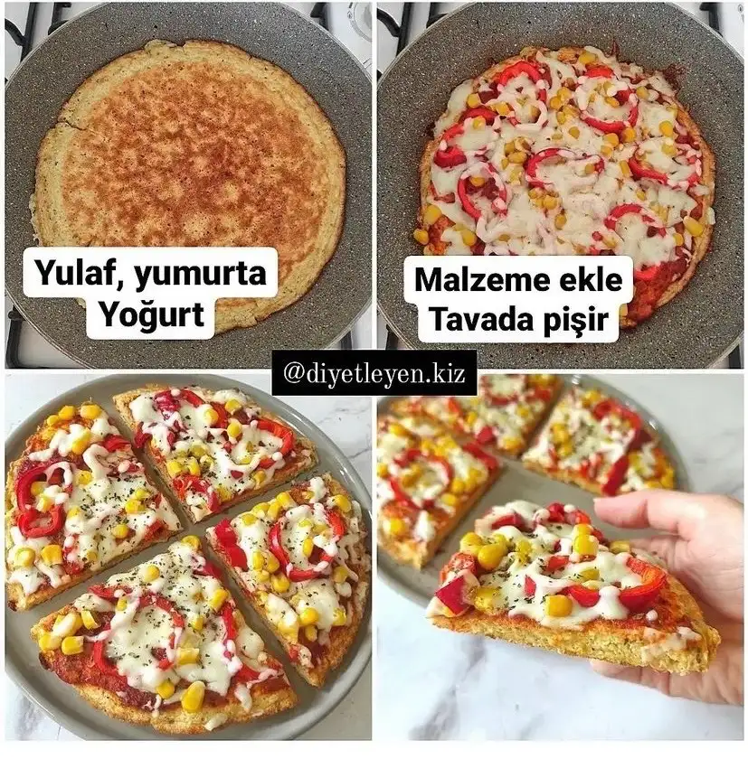 Ben pizza yapıp yiyiyordum bir ara öyle deneyebilirsin. Yulafı tavada kavuruyordum üstüne yumurta ekliyordum. Kenarda önceden doğradığım hazır malzemeleri sıralıyordum. Tencere kapağını kapatıyordum üstüne ki buharıyla üsttekiler de güzelce pişsin diye. Normalde eşim yulaf falan sevmez ama bayılarak yedi kaç defa yapınca Baya pizza oluyor.