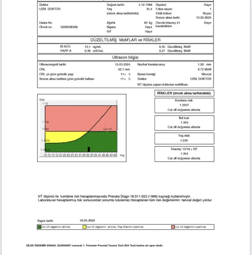 Raporunuzun fotografini paylasir misiniz mumkun muKızlar aranızda 35 yaş ve üstü olup ikili test sonucu riskli çıkam var mı? Bugün sonucum çıktı, yaştan dolayı riskli grupta çıkmışım. 35 yaşındayım. Doktor Fetal Dna önerdi