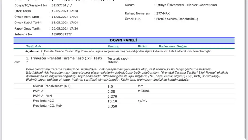 Merhaba rapor sonuçlarım bu şekilde çıkmıştı. Bakalım fetal dna sonucunu bekliyoruz, inşallah temiz çıkıcak öyle umut ediyoruzRaporunuzun fotografini paylasir misiniz mumkun mu