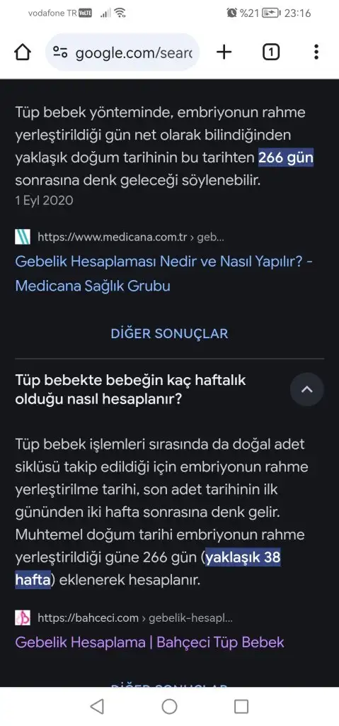 Devletteki detaylı ultrason çeken doktor transfer tarihinden 14 gün önceye giderek hesap yapılır tarzı Bi şey dedi o yüzden 14 şubatı baz aldı adet tarihi olarak 8 şubat yerine benimde aklım orada karıştı İnternette baktım şimdi diyorki transfer tarihinde 2 haftalık hamile kabul edilirmişiz yani transfer tarihinden sonra geçen haftalara 2 hafta eklenirmiş o döllenme süreci vs için birde şöyle yazıyor doğum gününü hesaplamak için transfer tarihine 266 gün ekleyin bunu yazan sayfalar hep tüp bebek doktorları Bi şey anlamadım ben bu iştenDoğal yolla olsa bile adet tarihinden ortalama 15 16 gün sonra yumurtlarsın yumurta tüplerde döllenip 2 3 gün içinde rahime gelir ve 2 gün içinde yerleşme gerçekleşir. Yani rahimin en iyi zamanını yakalamak için doğalı taklit etmek için de adetten ortalama 17-21 gün sonra transfer oluyor tabi istisnalar hariç sizinki geç değil tam zamanı.