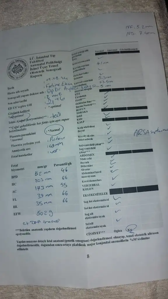 Bana da boyunun yazdığı rapor vermediler aynı seninki gibi baş karın çevresi vs tek tek ölçümler yazıyordu da kendi doktorum boyunu söyledi. Çok şükür detaylı ultrasonuda atlattık bana da 3 hafta oluyor🤍 inşallah sağlıkla doğumu da atlatıp kucağımıza alırsak🤲🏻🤍