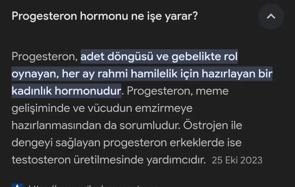 Baktırmak lazım çok önemli bir hormon yumurtlama günü ovülasyon testi ile takip ediyorsan pik günü kandan estradiol bakılıyor egerki 190 üzeri çıkarsa bu senin o ayki yumurtanın sağlıklı bir folukul yumurta olduğunu soluyor yumurtlamadan 7.8.9 günü progesteron hormonuna bakıyorsun eğer 3ve üzeri ise değer yumurta sağlıklı bir şekilde çatladı demek benm yumurtlama oluyor 22m büyüyor ama progesteron çok düşük çıkıyor progesteron bebeğin tutunmasini sağlayan hormon benim luteal faz dusuklugude var misal yumurtlamadan 8.gunu leke şeklinde geliyor 10.gun regli oluyorum Normalde en fazla 14gun sonra gelmesi lazımCanım progesteron ne oluyo ben hiç baktirmadim