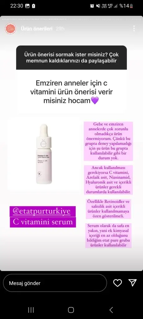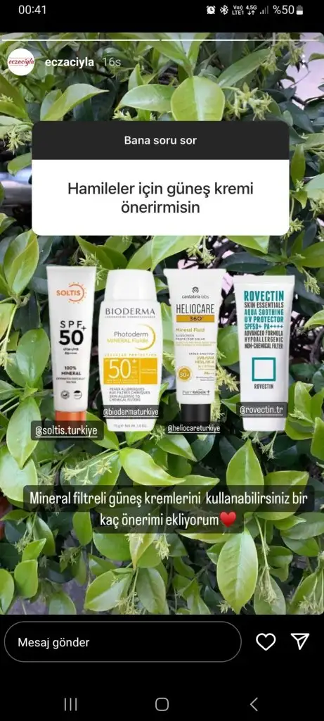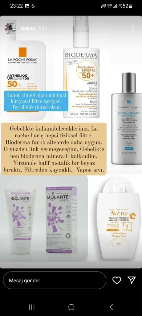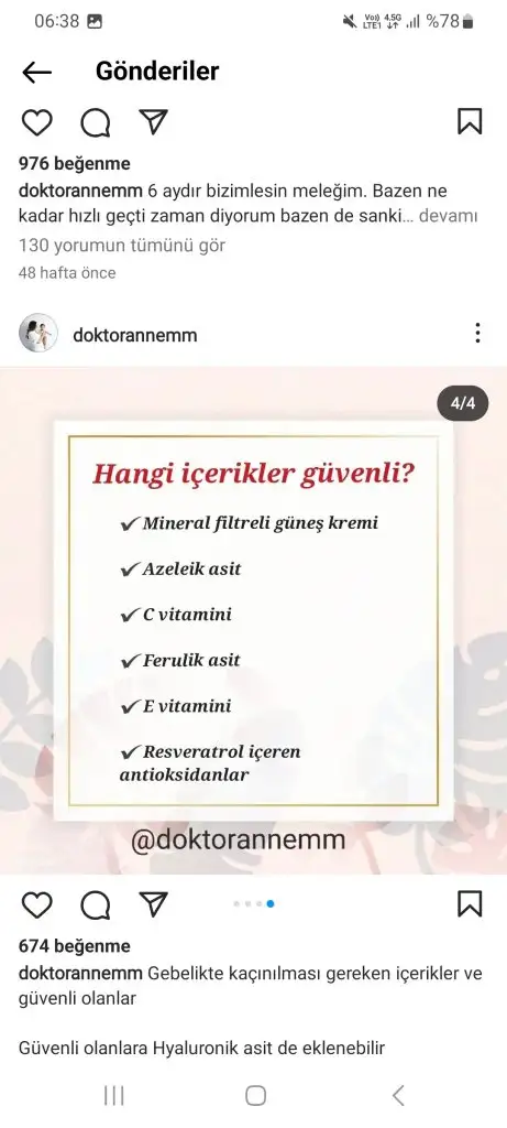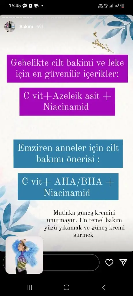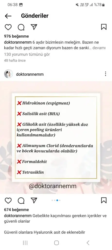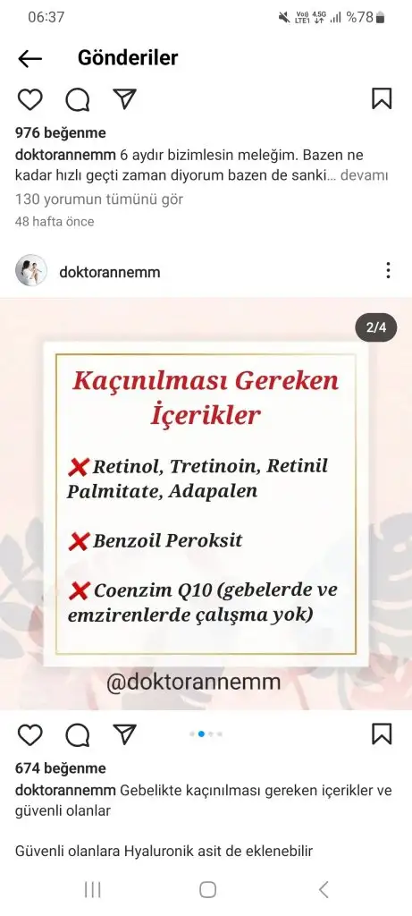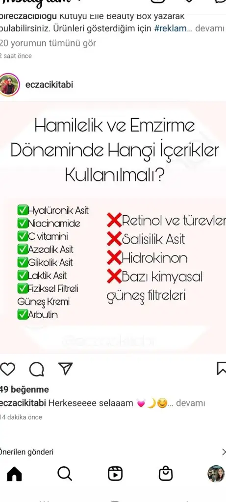 Retinol kesinlikle kullanılmiyor. Kimyasal filtreli güneş kremi yasak. Aha bha asitler yok.(Özellikle yıkama jellerinde salisilik asit oluyor dikkat edelim içerik okuyalım.) Alkol denat olmamali.(özellikle toniklerde) C vitamini, hyaluronik asit, niacinamide kullanılabilir. Lekeler için azeleik asit kullanılabilir. Kesinlikle mineral filtreli güneş kremi kullanmak lazım. Ben soltis, avene mineral ve heliocare 360 mineral aldım ama henüz gelmedi. Dermoeczanem online alışverişte güvenilir. Trendyolda satıcıya dikkat etmek lazım sahte ürün geliyor o yüzden pek tercih etmiyorum, sadece güvenilir saticiysa alırım.Arkadaşlar bu hamilelikte kullanılabilecek kozmetik ürünlerini anlatan bi doktor falan var mı? Normalde kullandığım serumlar kremler var hangisine devam edebilirim bilmiyorum