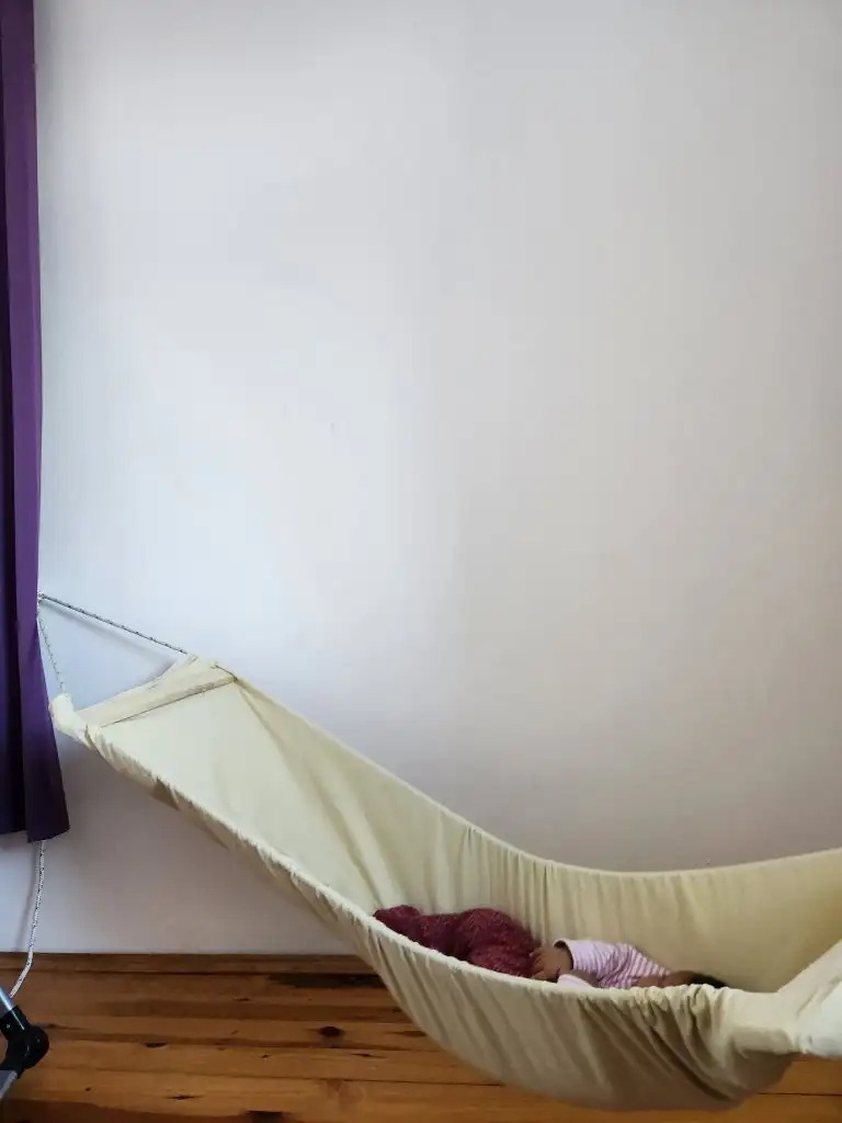 Onun gibi aslında duvarı deldi eşim matkapla duvardan duvara yaptik bi farki var mi bilmiyorum fotograf atıyorum böyle duruyor icinde. Elinizde çarşafla sallayınca uyuyor mu bi deneyin amme süresini de açın çok etki etti bizde.çingene beşiği nasıl oluyor canım ? hamak beşik var bende ama sevmedi durmuyo içinde