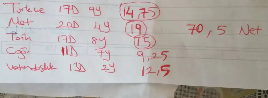 En düşük olabilir canımda ama yani bu netler başlangıç için gayet ideal bence. Ben deneme yapınca buraya yazacağım ve inan senin sonucuna yaklaşırsam öpüp başıma koyarım.Kızlar merhaba herkese. Bugün ilk denememi yaptım. Korkup kaçıyordum ama gerçeklerle yüzleşmek gerektiğini anladım. Netlerimi atayım. Kızlar ben dün elimde olan soru bankalarının çözemediğim testlerini kopardım, zımbaladım. Onlar duruyor. Bir de bugünkü deneme analiz edilecek. Kafam karıştı o testleri ve buradaki yanlış yaptığım konuları eş zamanlı nasıl çalışacağım. Video ders notu siparişi verdim daha kargoya vermediler. Netlerim de berbat açıkçası biraz moralim bozuldu. Beynimde kalmamış çalıştıklarım :) Tavsiyelerinizi almak isterim. Herhalde en kötü net benimki